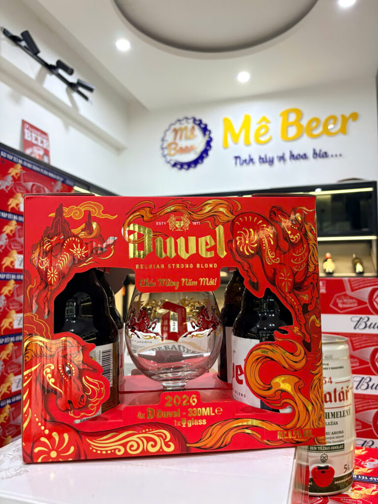 Mỗi hộp quà bao gồm: 4 Chai 330ml + 1 Ly Bia Duvel 8.5%